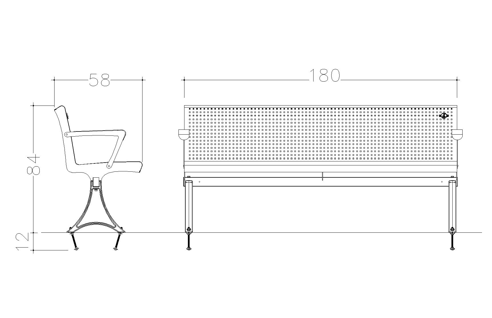 ספסל מדגם “נעמן רגלי מתכת ומסעדי יד” עם משענת עשוי ממתכת. הספסל מורכב ממתכת מגולוונת ומנוקבת עם צלעות פלדה מרותכות וצבועות בתנור. ניתן לקבל במגוון צבעים בהתאם לקטלוג RAL. מגיע במידות 180X58 ס”מ ובגובה84 ס”מ. הספסל ומידותיו מותאמים לתקן הנגישות 1918. התקנה: הספסל מעוגן לקרקע בעזרת 4 עוגנים.